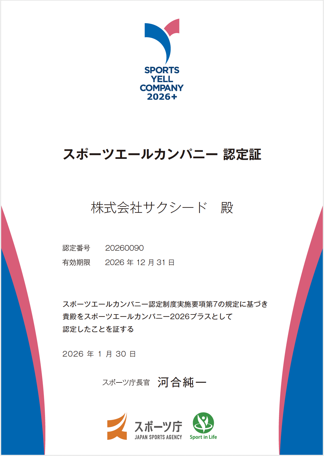 2026年1月30日、弊社はスポーツ庁が実施する「スポーツエールカンパニー2026プラス」に認定されました。