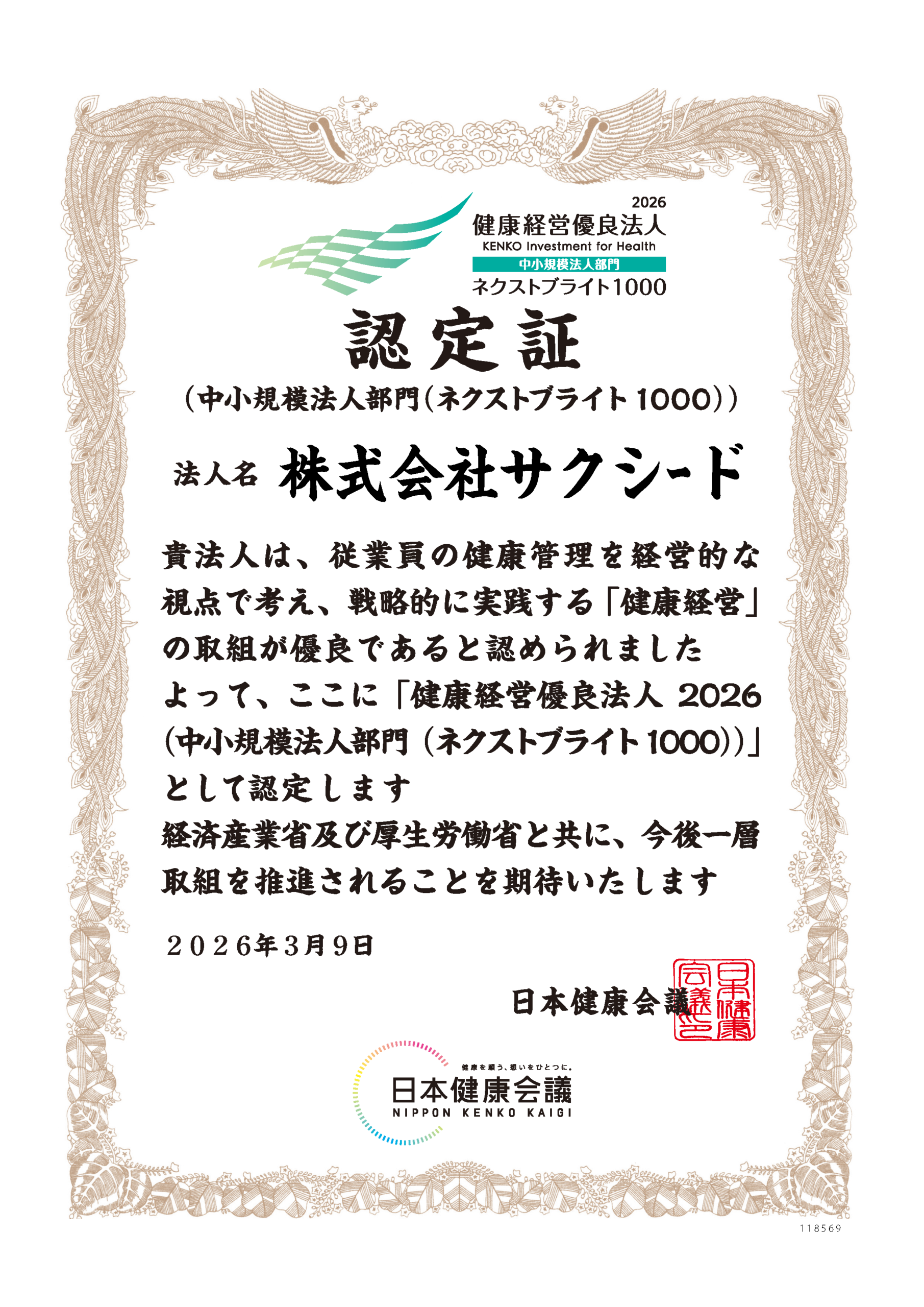 2026年3月9日、弊社は経済産業省と日本健康会議が共同で実施する「健康経営優良法人」認定制度において、「健康経営優良法人2026(中小規模法人部門)」に認定されました。