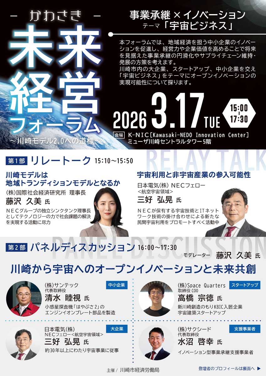 本フォーラムでは、地域経済を担う中小企業のイノベーションを促進し、経営力や企業価値を高めることで将来を見据えた事業承継の円滑化やサプライチェーン維持・発展の方策を考えます。川崎市内の大企業、スタートアップ、中小企業を交え「宇宙ビジネス」をテーマにオープンイノベーションの実現可能性について探ります。