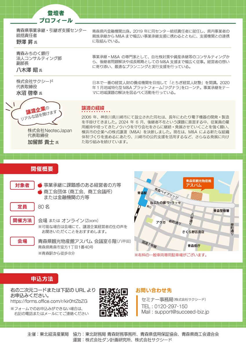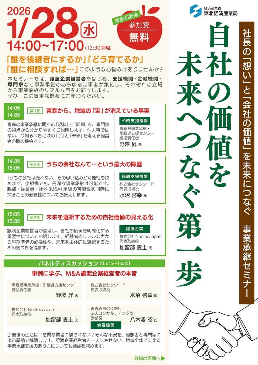 青森の事業承継に関する「現状」と「課題」を、専門家の視点から分かりやすくご説明します。他人事ではない、今知るべき地域の「今」と「未来」を考える経営者必聴の機会です。