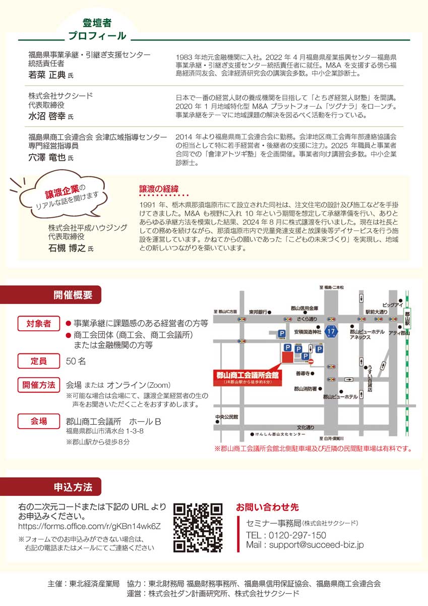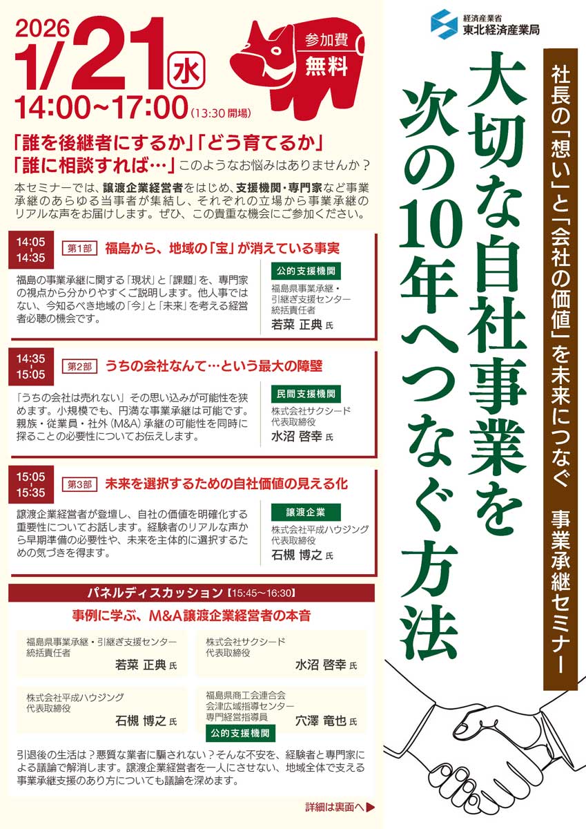福島の事業承継に関する「現状」と「課題」を、専門家の視点から分かりやすくご説明します。他人事ではない、今知るべき地域の「今」と「未来」を考える経営者必聴の機会です。